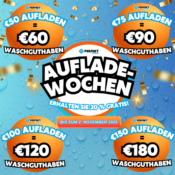 Bei Perfekt Carwash machen wir Ihre Autowäschen jetzt noch günstiger während der Aufladewochen. Vom 6. Oktober bis 2. November 2025 erhalten Sie beim Aufladen Ihres Guthabens nur bei ausgewählten Aufladebeträgen automatisch bis zu 20% extra Waschguthaben.